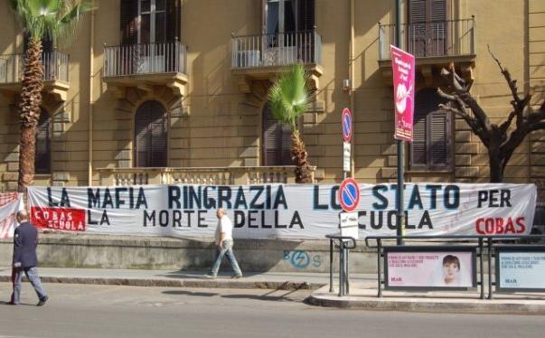 Lo scorso anno i Cobas hanno subito una pesantissima repressione: tre militanti sono stati fermati, prelevati tra le decine che sostenevano uno striscione con la scritta LA MAFIA RINGRAZIA LO STATO PER LA MORTE DELLA SCUOLA, portati in questura e denunciati.