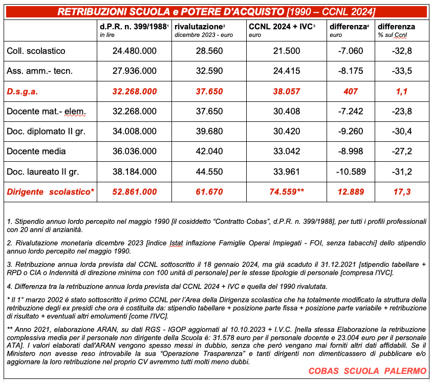 Comunque, la situazione salariale continua a essere quella che denunciamo da anni e che ha determinato la situazione sintetizzata dalla tabella sottostante, il personale docente e ATA ha perso decine di punti percentuali di potere d’acquisto, il DSGA ha faticosamente mantenuto il proprio, mentre è stata “premiata” la figura del dirigente scolastico, garante della trasformazione della Scuola da istituzione pubblica a soggetto para-imprenditoriale.