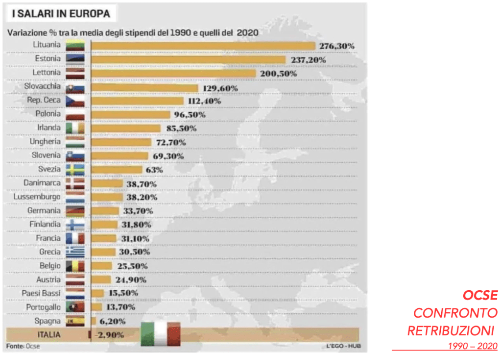 D’altronde l’OCSE [vedi la seguente tabella] rileva, in questo stesso arco di tempo, un decremento complessivo dei salari che non si riscontra in nessun altro paese e che certifica gli effetti negativi delle politiche economiche che in questi ultimi decenni hanno colpito i redditi dei lavoratori dipendenti, facendoci pagare i costi di tutte le crisi che si sono susseguite.