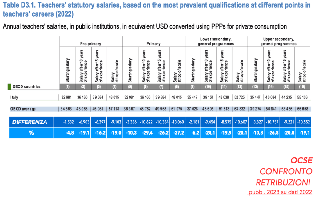 Infine, anche l’impietoso confronto tra i salari dei docenti italiani e la media OCSE [Tabella D3.1] lascia pochi dubbi sullo scarsissimo riconoscimento che il nostro lavoro riscuote presso i nostri Governi e tra le organizzazioni sindacali che continuano a sottoscrivere CCNL che determinano questo progressivo impoverimento delle nostre retribuzioni.