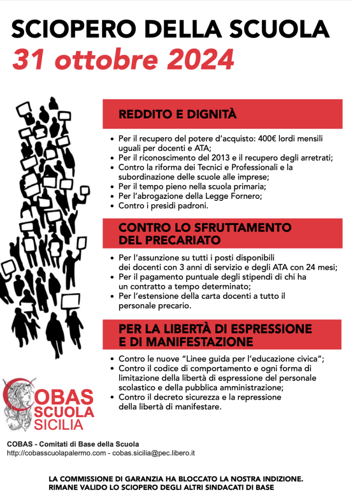 Docenti, ATA e precari della scuola lottano per una scuola aperta a tutti, sganciata dalle logiche aziendali e padronali, contro tagli e precarizzazione, per stipendi europei, per il recupero del potere d’acquisto e chiedono 400€ lordi mensili uguali per tutti, docenti e ATA.