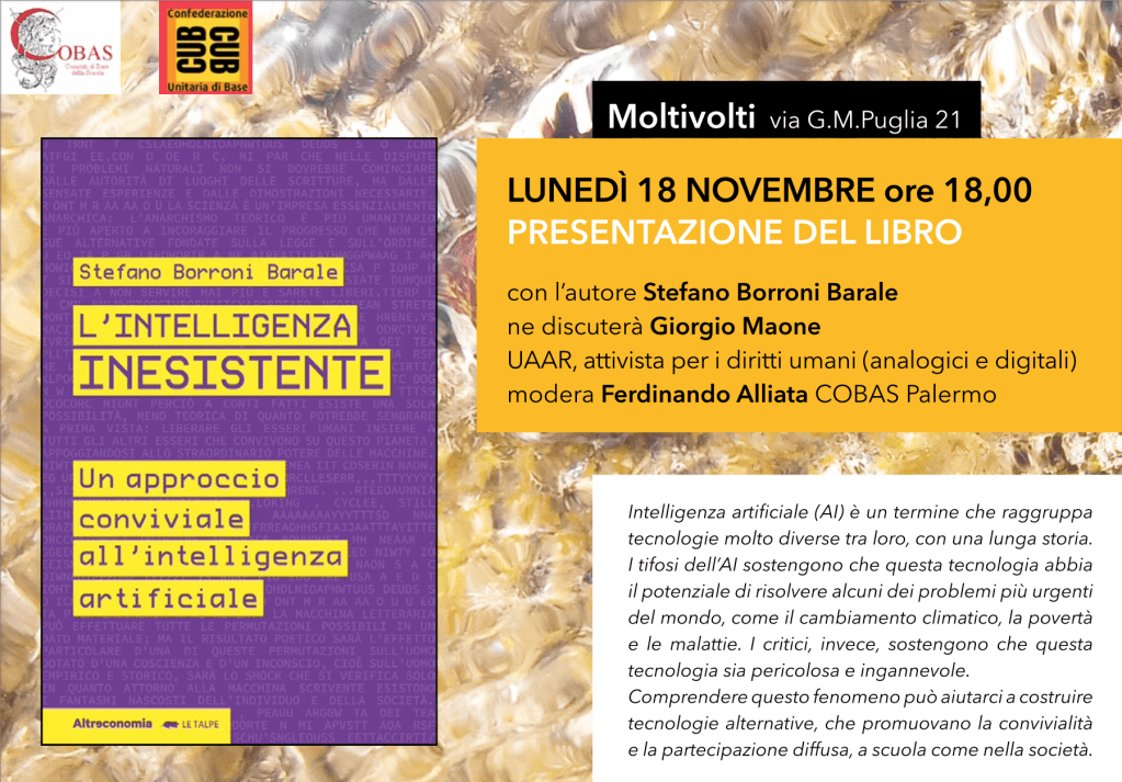Approfittando della presenza a Palermo di Stefano Borroni Barale, che sarà uno dei relatori del Convegno LA SCUOLA NELLA TRANSIZIONE DIGITALE. Il prossimo futuro di didattica e lavoro, alle ore 18.00 di lunedì 18 novembre, nei locali di Moltivolti, in via Giuseppe Mario Puglia n. 21, presenteremo il suo libro L’INTELLIGENZA INESISTENTE. Un approccio conviviale all’intelligenza artificiale, ed. Altreconomia – 2023.