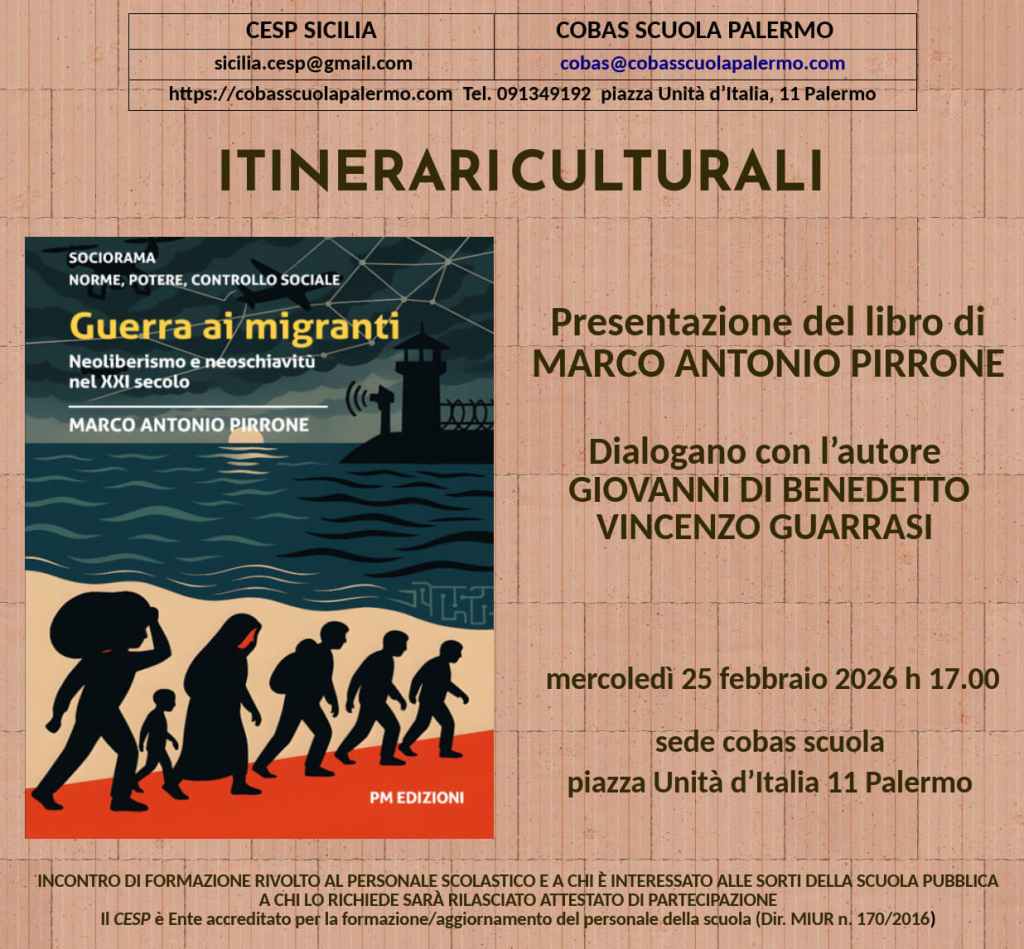 Nel prossimo appuntamento dei nostri Itinerari Culturali, presenteremo il libro di Marco Antonio Pirrone Guerra ai migranti. Neoliberismo e neoschiavitù nel XXI secolo, PM edizioni.