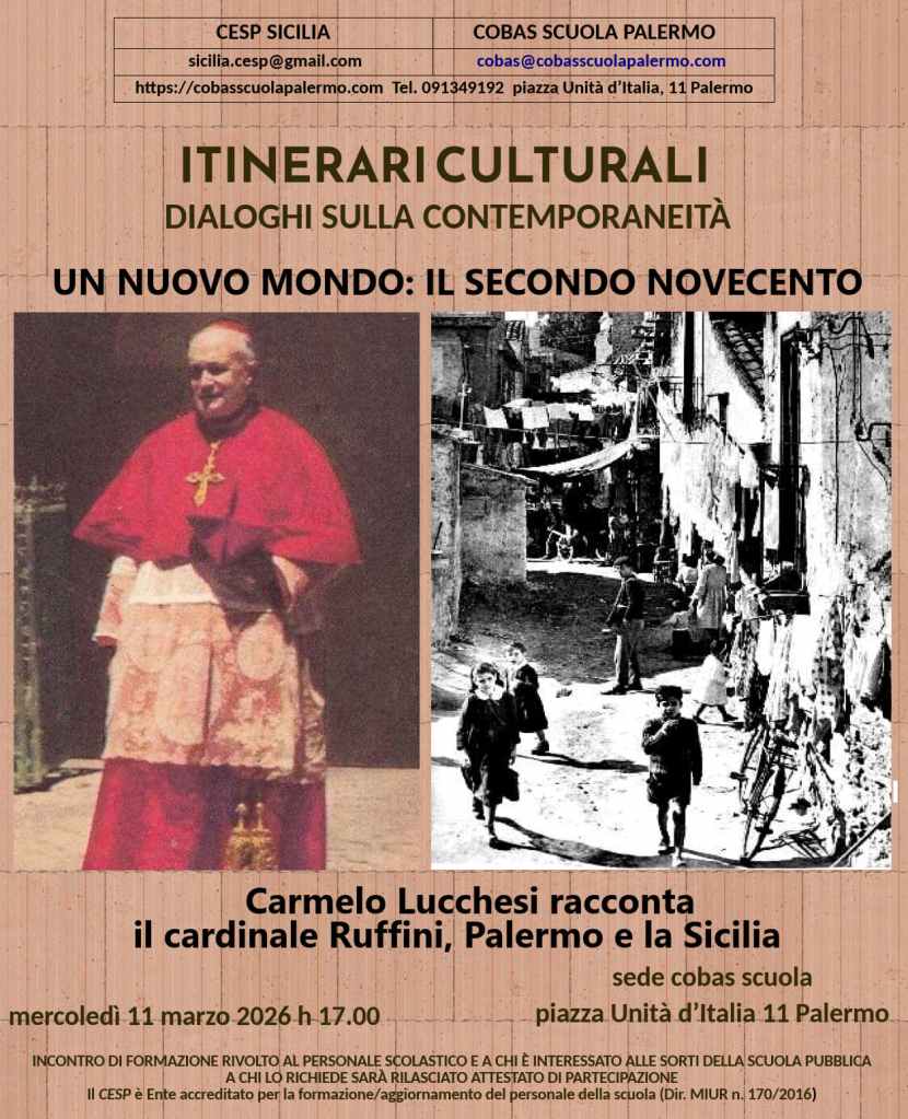 Il tema del prossimo appuntamento dei nostri Itinerari Culturali sarà incentrato sulla figura del cardinale Ernesto Ruffini che durante la sua ultraventennale reggenza in Sicilia ha influenzato profondamente il clima politico, sociale e culturale.