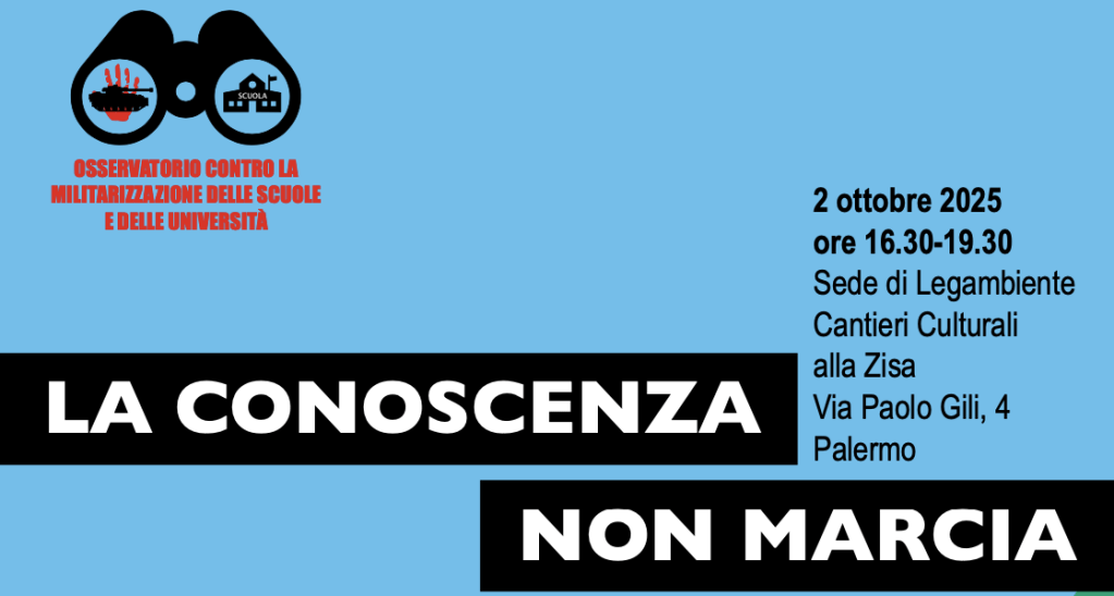 Dopo che il MIM ha annullato il corso di formazione e aggiornamento «La scuola non si arruola», che il CESTES-PROTEO [ente accreditato] aveva organizzato per il 4 novembre 2025, l’Osservatorio contro la militarizzazione delle scuole e delle università ha deciso di confermare ugualmente la data con un nuovo Convegno che – però – non ha l’accreditamento del MIM, per cui non è possibile chiedere un esonero per formazione per il personale scolastico.
