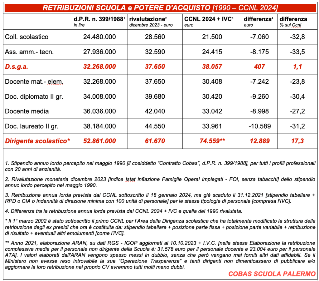 Come è chiaramente visibile nella tabella, l’assenza di meccanismi di tutela dei salari [la SCALA MOBILE è stata abolita nel 1992] ha determinato nel corso degli ultimi decenni una secca riduzione di tutte le retribuzioni, accompagnata dall’introduzione di meccanismi di ricerca di salario accessorio individuale scuola per scuola, tali da determinare crescenti divisioni e tensioni interne al personale docente e ATA, oltre all’aumento del potere dei dirigenti e al rafforzamento di gruppi di potere [cerchio magico] intorno ai dirigenti stessi.