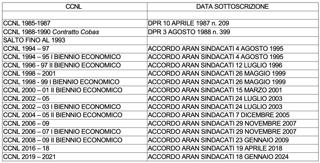 Un altro “punto fermo” è il ritardo con cui regolarmente sono stati siglati i contratti fino all’odierna vicenda con un accordo ARAN e sindacati del 14 luglio 2023 e contratto siglato in via definitiva il 18 gennaio 2024 che riguarda il periodo 2019 – 2021! A questi ritardi si aggiungano i “buchi” di rinnovo contrattuale: quello del 1991 – 1993, di cui abbiamo già detto, e quello addirittura di 6 anni tra il 2010 e il 2015 [vedi la seguente tabella].