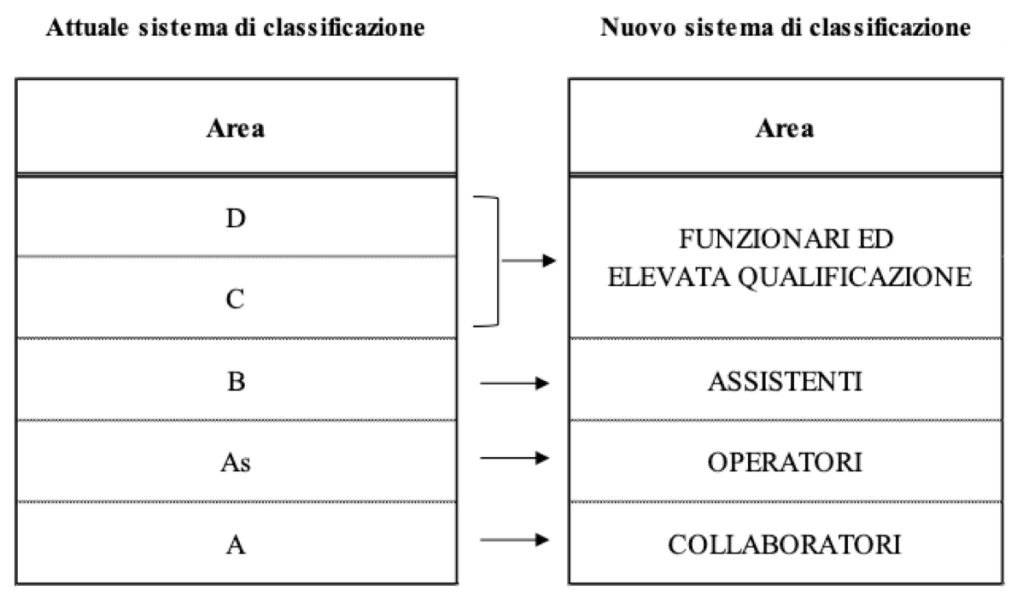 Oltre a limitati interventi per quanto riguarda la responsabilità disciplinare [articoli da 22 a 29] il CCNL modifica l’Ordinamento professionale [articoli da 49 a 60] che entrerà in vigore il 1° maggio 2024 [art. 59, comma 1] con la trasposizione prevista dalla seguente tabella, che crea non poche perplessità sulla fase transitoria e sull’acquisizione dei titoli di accesso richiesti: