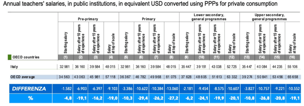 Infine, anche l’impietoso confronto tra i salari dei docenti italiani e la media OCSE [2023, tabella sotto] lascia pochi dubbi sullo scarsissimo riconoscimento che il nostro lavoro riscuote presso i nostri Governi e tra le organizzazioni sindacali che continuano a sottoscrivere CCNL che determinano questo progressivo impoverimento delle nostre retribuzioni.